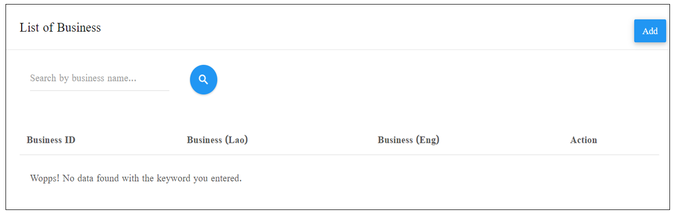 v When click on List of Business, the information page will be displayed consisted of: Search button, add button, edit button and Delete button. as shown below: