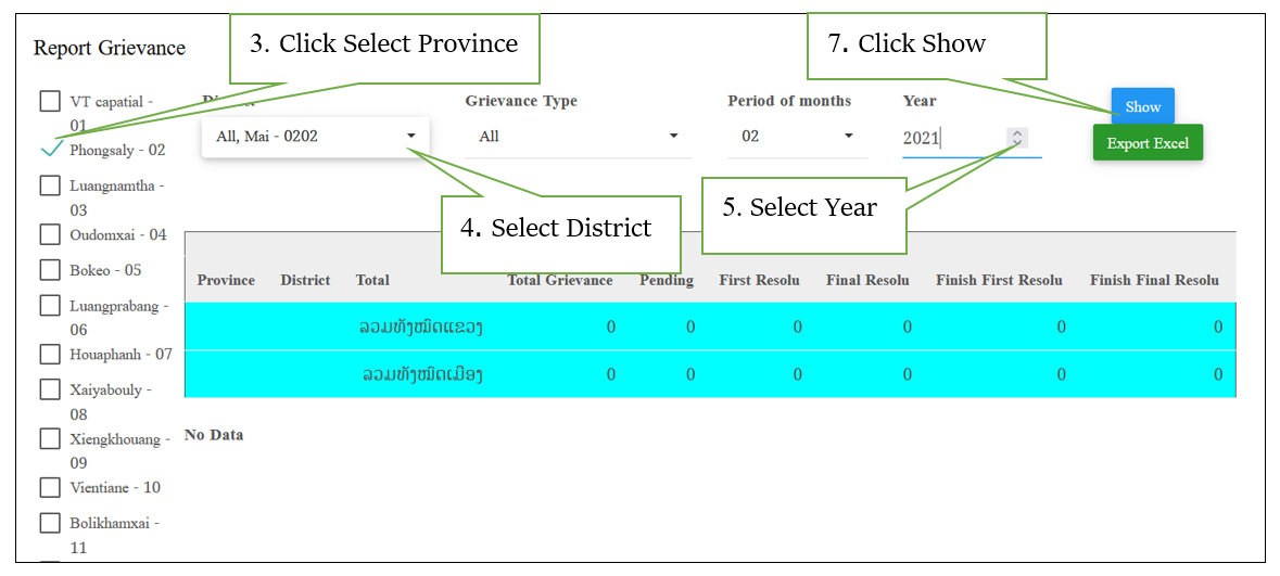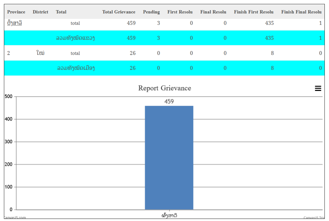 Reports the total number of grievances within the province, district and village. As shown below: