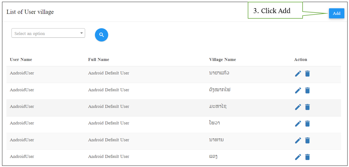 When click on List of villages, the system page will be displayed consisted of: province select button, district select button, village select button, search button, add button and etc. as shown below: